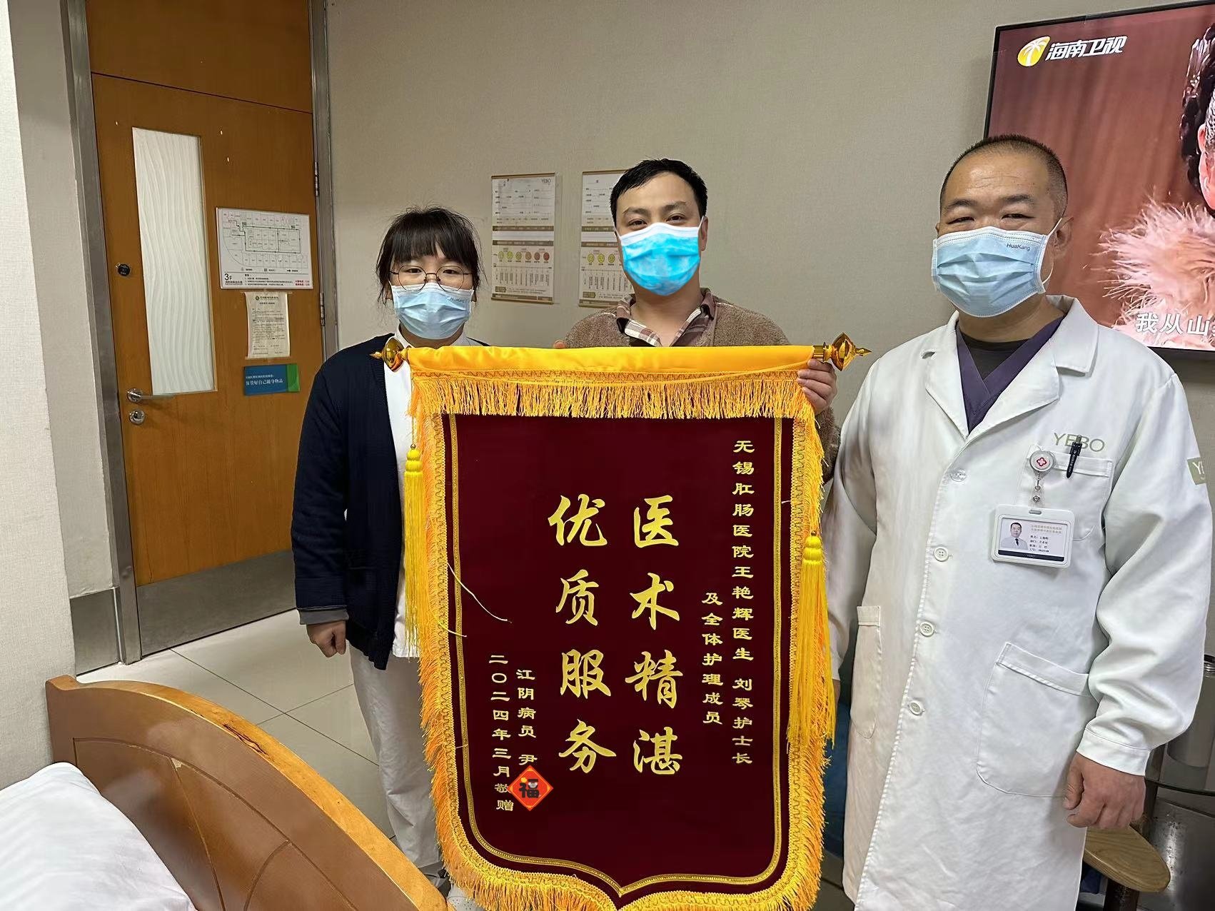 同样来自无锡江阴的尹先生,也在我院得到了满意的治疗效果。他赠送的锦旗上同样写着“医术精湛,优质服务”,这次是赠予王艳辉医生及刘琴护士长。尹先生的这份赞誉,不仅是对医生和护士专业技能的认可,更是对他们细心照料和热情服务的感谢。这面锦旗,让我们更加坚信,优质的医疗服务能够赢得患者的信任和尊重。